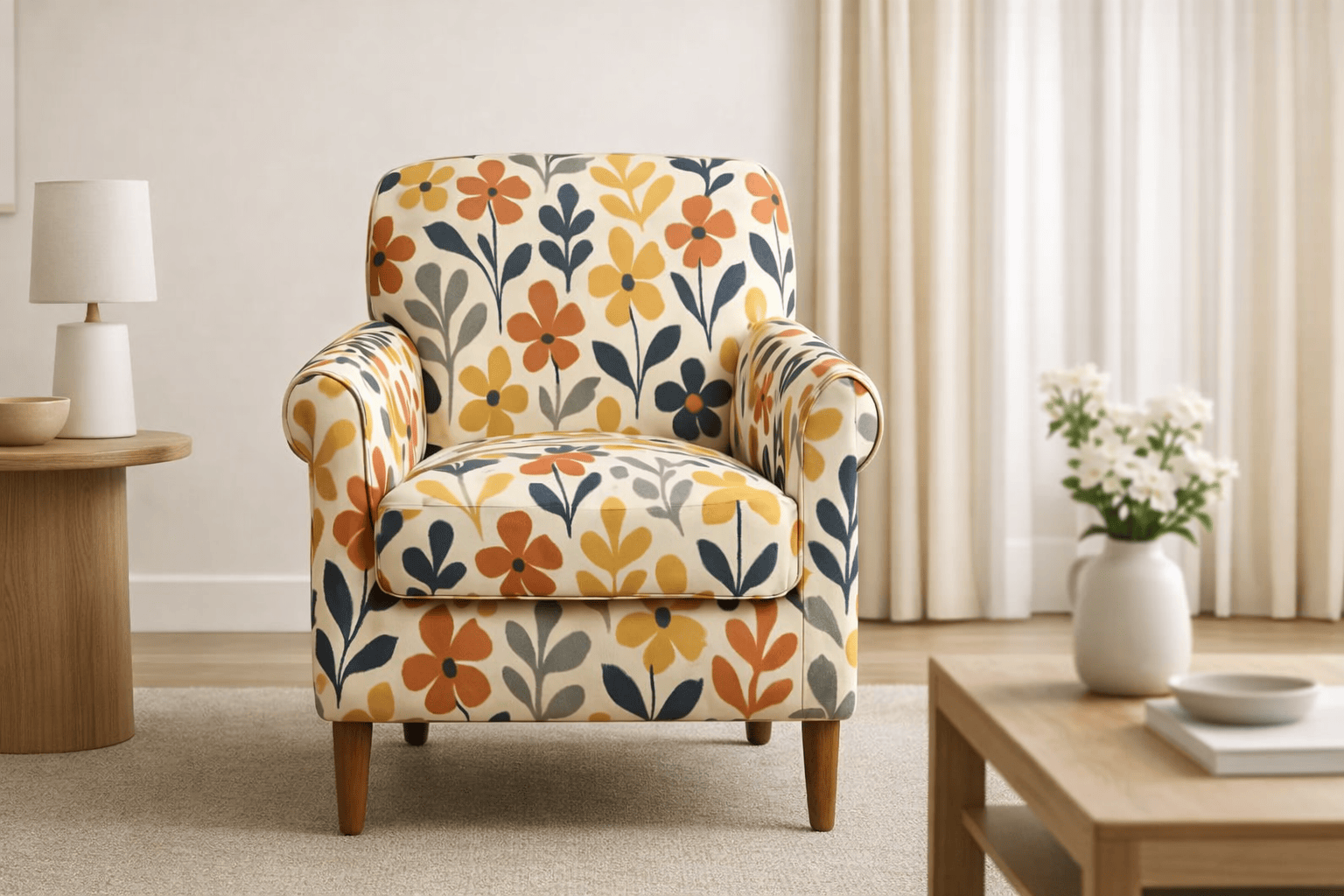 Sedie rivestite in tessuto blu con motivo di uccelli e fiori, abbinate a gambe in legno. Linee semplici e materiali selezionati, pensate per un utilizzo quotidiano e uno stile equilibrato.